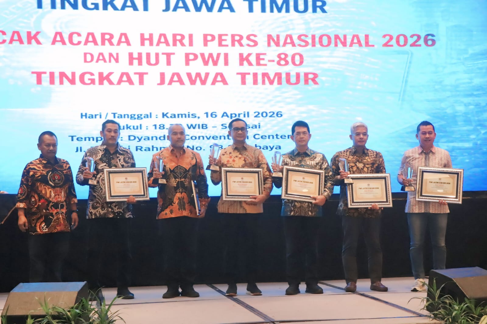 Penghargaan tersebut diberikan dalam rangkaian Peringatan Hari Pers Nasional tingkat Provinsi Jawa Timur 2026. Persatuan Wartawan Indonesia (PWI) Jawa Timur menggelar Resepsi Puncak HPN & HUT PWI ke-80 di Dyandra Convention Center, Kota Surabaya, Kamis (16/4/26) petang.
