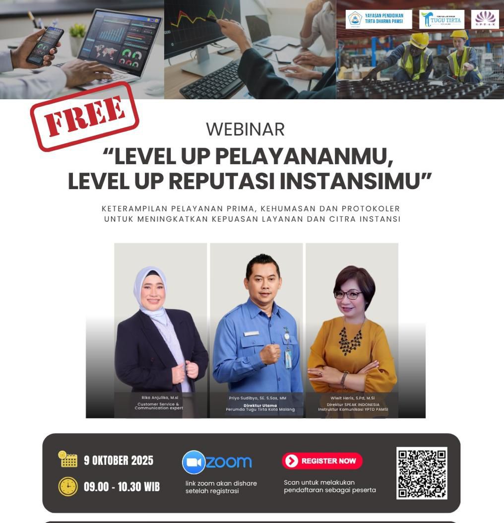 Webinar yang diinisiasi oleh Yayasan Pendidikan Tirta Dharma Pamsi bersama Tugu Tirta dan mitra lainnya tersebut digelar secara daring Kamis (9/10/25), dengan menghadirkan pembicara dari berbagai latar institusi untuk membahas strategi pelayanan prima, kehumasan dan protokoler guna memperkuat citra institusi.