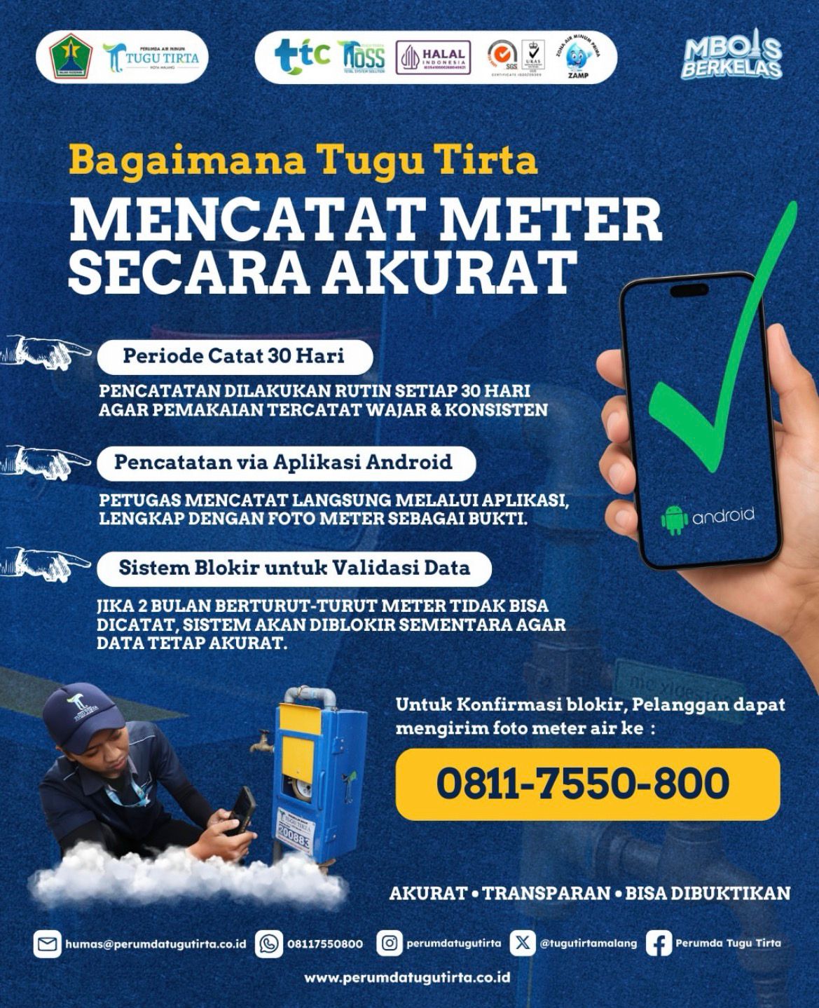 KOTA MALANG – Perumda Air Minum Tugu Tirta Kota Malang terus menjaga keakuratan pencatatan meter air sebagai bagian dari komitmen menghadirkan layanan yang adil dan transparan bagi pelanggan.